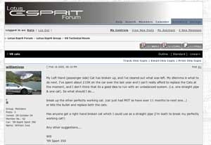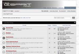 www.lotusespritforum.com is a new forum that has been set up to possibly take over from the UK Yahoo! Group in the future. It's a thread base forum and has many good features. Hopefully it will catch on and become the main source of information for Esprit owners. Visit it and register, then you can try it for yourself.–––––––––––––––