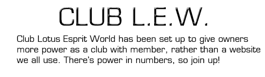 Club Esprit has been set up to take advantage of the many offers set up and being set up by LEW for Esprit Owners. With more members, we'll have more power to get bigger and better discounts. Previously discounts have been available to anyone mentioning Lotus Esprit World. But as the club has evolved, these are now only available to Club Members.