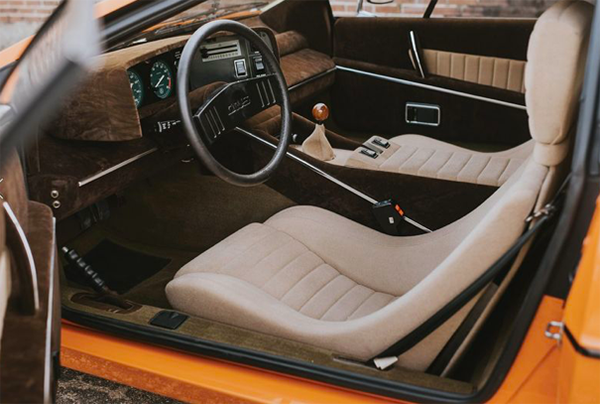 A 1979 Lotus Esprit Series 2. The interior includes soft red fabric stitched in plump rolls; the four-cylinder engine is visible through the transparent rear hatch. Photographer: Hannah Elliott/Bloomberg