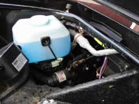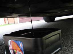 Once you can get under the car, you'll need to remove the sump drain plug. This is a 19mm bolt with a plastic washer. Undo it slowly, as if you just pull it out, you find a wave of oil heading in your direction. Have a container under the plug to catch the oil. I used a reusable can from a local motor parts shop. To help drain the oil, we lowered the Esprit and jacked up the front. This helps to get more of the oil out of your sump. Once the oil stops draining, replace the sump drain plug and washer and lower the Esprit if you don't want to remove the oil filter from underneath.