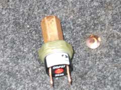 (THE OLD SWITCH, THE BRASS CONNECTOR AT THE TOP IS REUSED)The offending switch was removed and Andy popped off to the stores in search of a replacement. The switch is connected to the compressor by a brass connector which is removed and reused on the new switch.