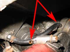 It's a simple set up in to the panel. Two short pipes attached to the wastegate and come into the side of the panel. The red arrows point to the two connections. You can see the pipe that comes into the bottom of the panel still fitted. We removed these old pipes and fitted the new ones.
