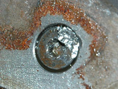 The corrosion under the shim (seen on the right as white residue) seems to have lifted it fractionally which resulted in a jammed pad and a warped disk in my case !