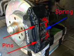 I use copper grease (anyone sense a repeating theme here ?) on the parts that are in contact with the caliper, this means the end which make contact with the shim plates and the back of the pad which is in contact with the pistons. All this use of copper grease ensures when you do the job again the parts should just come off as if they were brand new and make your life much easier - you should be able to change a well maintained braking system in well under 30mins. Refitting is simply the reverse of removal, being new they should slide in with little to no effort.Fit the spring and retaining pins back into the assembly, knock the pins from the back, ensure they are in fully using an appropriate sized pin punch.
