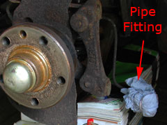 I would tend to take the caliper off if you are changing the disk, the reason being is that the caliper is supplied with rigid hydraulic pipe, in the action of taking the disk off there is a possibility that this pipe could be bent and damaged when you move the caliper out of the way. It is much better practice and safer to remove the pipe where it meets the caliper so that the unit can be taken off, the downside is that the brakes will have to be bled when re-fitting.Firstly the pads will have to be removed (see above) and then remove the hydraulic fitting to the caliper which is located on the inside at the bottom, undo it using a 11mm spanner. Brake fluid might leak from this pipe so be ready to catch any fluid. The image below shows the near side brake caliper removed with a piece of absorbent paper over the end of the brake pipe fitting.