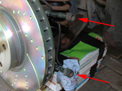 Next you will need a 10mm allen key to undo the 2 cap head bolts (arrowed centre with the caliper already removed) holding the caliper onto the hub bracket, the caliper is now free and can be taken off the car.