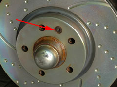 Finally the disk is held on by a small cap head bolt (arrowed right) which is in-between 2 of the wheel nut holes in the disk, this needs to be removed in order to take the disk off. On a few cases I have heard this bolt can become seized, the 1st one I did was fine but the other side was a nightmare - see below on how to take this bolt out if it seizes.
