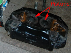 Before working on the caliper it is worth draining the hydraulic fluid from inside it, do this by pushing the pistons / pots back into the body of the unit, this also helps bleeding (see below). Be very careful as oil can come out at force so direct the hole where the fitting was which was taken off into a suitable container - remember brake fluid hates paintwork so keep this well away from your car's bodywork.