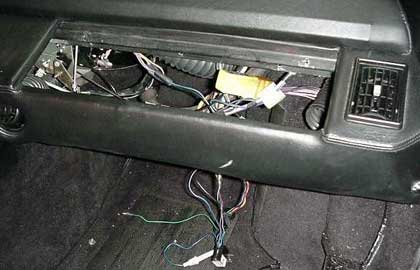 Next, remove the glove box door and glove box; this will give you the necessary room in which to remove and install the new antenna, as well as access the wiring necessary for connection. Simply remove all the screws, nuts and bolts that hold the glove box in.