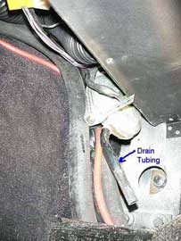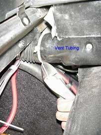 Disconnect the passenger-side air vent hose that connects to the air vent by snipping the tie-strap and pulling off the vent tubing. This will allow the exposure of the antenna once the wheel arch cover is removed. This view is from the glove box area.