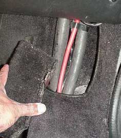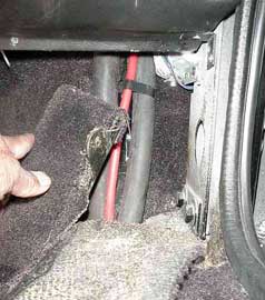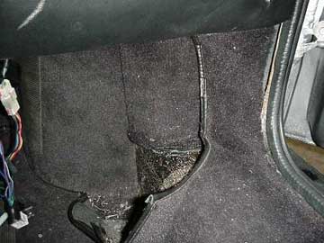 Inside the passenger footwell area at the base of the front wheel arch, peel away the carpeting just enough to expose the bottom and the right side of the wheel arch cover.