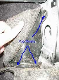 There will be a series of pop-rivets holding this cover in place; two on the bottom, and one on the right side. Remove them by drilling them out. Self tapping screws will be used to replace these rivets upon re-installation.