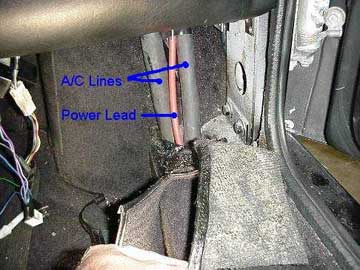 With the wheel arch cover removed, you will see a series of A/C hoses and red power lead running up along side the front wheel compartment. The antenna will be located up and to the right of these hoses.