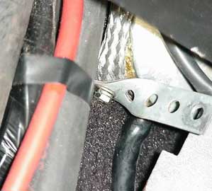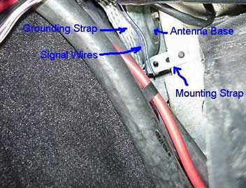 The old antenna should now be fully exposed; carefully note how the wires are run through the dashboard and how they are connected to the old unit. Also note how the grounding braid attaches from the top of the antenna to the bottom of the unit.