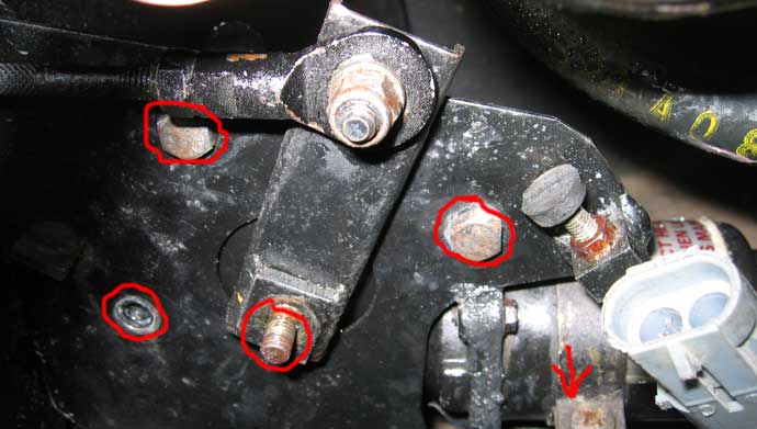 The motor is held in place by 3 bolts onto the holding plate and one bolt on a support arm. There is also a screw and nut (arrow above) holding the arm onto the motor and a further bolt (not seen in the pic above) holding the arm onto the bodywork.