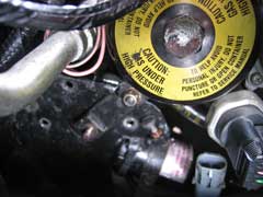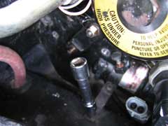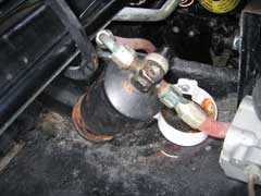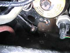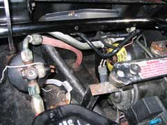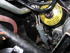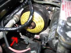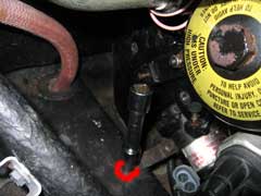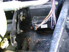 Unfortunately for us, our offside motor failed, which is situated under the ABS and Air-con bits, making it 10 times more difficult to get at than the near-side motor. You can't really see it from the top. The red arrow give you an idea of where it is. To help access, we undone the clamp holding the Air-con bottle after removing the plastic covering. This makes it a little easier and saves a little more skin on your knuckles. One nut and bolt hold the clamp to the bottle. Carefully move the bottle to the side once removed from the clamp.