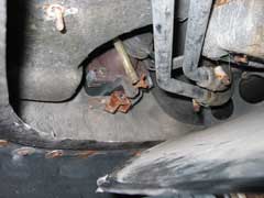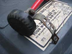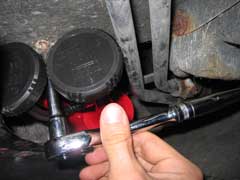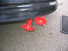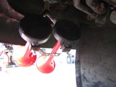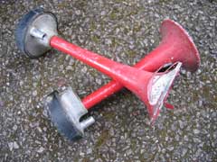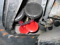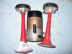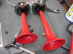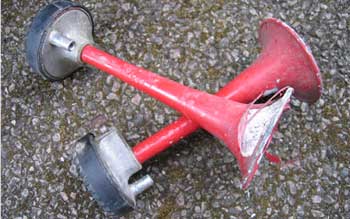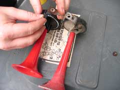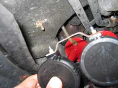 Once the panel is removed you should be able to see the horns. The picture above is of the new horns, as we didn't get a pic of the old ones. One Nut holds the horns to the car. Remove this and you should be able to pull the horns out and disconnect the piping from them. Remove the Y-piece, as this is being replaced.