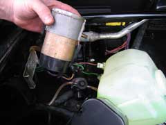 Tighten the nut and the horns are in. Replace the panel and thats the hard bit done. Our compressor was working fine, but as we had a new one (and it was an easy bit), we decided to fit it. Remove the washer bottle and the compressor is just behind it, in the wing. It's held in place with one nut. Remove the nut and take off the electrical connections and pipe.