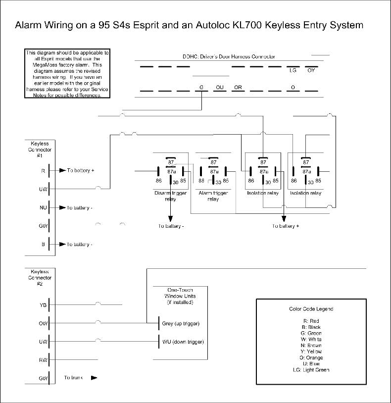 Status Wires in Continuity Trigger Pulse or Constant Unlocked Orange & Orange-Red Pulse Locked Orange & Orange-Blue Pulse Alarmed Orange & Orange-Blue & Orange-Yellow Constant Finding a keyless unit was simple for locking and unlocking. I just needed one that would output a negative trigger. I chose the Autoloc KL700 because it has enough triggers for me (7) and it includes code rolling technology (unlike the KL800) to make it harder for thieves to capture the code used to communicate with the unit.