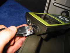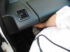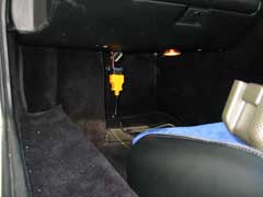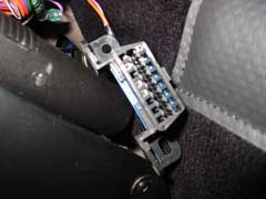 The reader has a large LCD display and plenty of features. Now for connecting it to an Esprit V8. We used a 1999 Sport 350 to test the reader on. This equipment should work on all V8 Esprits except the early 1996 model, which uses a different system. We used the connection under the passenger seat dash to connect our reader to. You'll probably need to get into the 'Lotus Position' to find the connector (see right). The connector can be pushed right up under the dash and may need some searching to find.