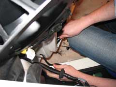 The Sleeving can be pushed towards its self to enable all the cable wiring and Plugs to be passed through it. Most of the cables will go through (do them a few at a time). The hardest part is the door grommet. The trick we used was to use electrical tape it tightly down to the cable. Now that the sleeving is mounted on the wiring harness stretching it out will make it small again, at this point using insulation tape over the ends to keep it tight and to enable fitting it through the Grommets, it should be now possible to slide the cable harness back through the Body just enough to fit through the Grommet in the Body behind the Door Hinge, it is possible to gain access inside the Body via the inner panel there to pull the cables through if needed.