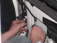 Once these are undo you'll need to feed all the wiring back towards the body. The Wiring is held in place via cable clips that are easy to undue. These run along the bottom of the door. The pictures are taken (above middle and right) from underneath the door.