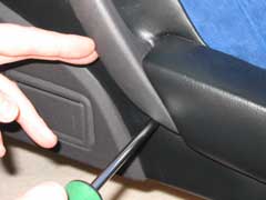 Remove the plastic surround to the Mirror Switch/Door handle care to be made not to scratch it, lever it from the bottom rear corner using a wide flat blade. Its clipped on. Remove the large and small Phillips screws from inside Door handle. There are two screws in the bottom corners of the door panel (picture shows bolts, as rusted screws have been replaced).