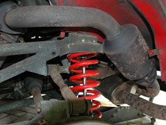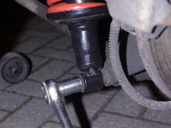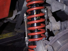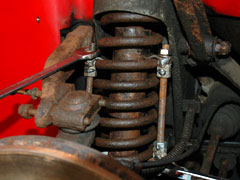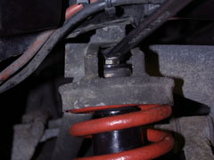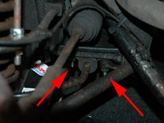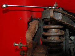2) Remove the front anti roll bar - this is the option I go for and it allows you to force the suspension (wishbone) down a lot further which means you don't have to compress the spring so much. To remove the anti-roll bar from the chassis simply remove the 2 bolts holding it on which are located under the steering arm gaiter - you can do all 4 (2 on each side) which makes it even easier. If you're doing both suspension sides this method is quicker.