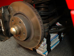 Start by positioning the car on a level surface, chock the rear wheels and apply the hand brake so the car doesn't move when jacking it up - Slacken the wheel nuts off 1/2 a turn and jack the car up as shown in the LEW guide elsewhere on this site. Remove the front wheel, before you do anything else you must put your safety support in place - I use paper packing to support my car because it has a large area to support on and will not collapse. I packed the underside of the lower wishbone out so if the car fell off the jack it wouldn't go very far, you won't be working underneath the car anyways so it should be quite safe, I also packed the chassis directly inboard from the lower wishbone fixing for when I would be taking the spring off - now the car is 100% safe.