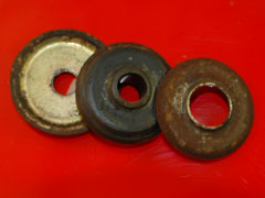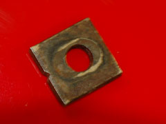The other shims are the camber angle plates, these are on the back bolt and site into a recess on each half of the upper wishbone. These plates can sometimes fall out so you need to be wary of them, they fit back into the recess with the little 'Vee' cut out facing outwards towards the wheel. These are critical - if you lose one or put them back wrong the car's front wheel camber setting can come out of specification which will affect cornering grip.
