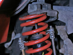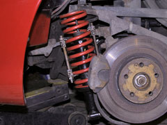 The front springs are extremely strong and unlike the rears will require a fair amount of compression. You can do this one of 2 ways...1) Compress the spring using spring compressors - these have to be heavy duty as the tension they will be under will bend smaller threads no problem, you also might need 2 sets to compress the spring enough as it's quite a small space to work in.