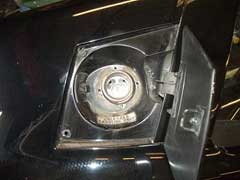 Air filter housing unit is removed by loosening 2 x 10mm headed bolts. Dont remove these, its far easier just to slacken them off enough to slide the housing out. Undo air intake hose from air box to outside and remove. Remove aluminium pipe from fuel filler point. This is done by releasing the petrol flap. Undo the 4 screws that house a steel ring around the filler plug.