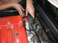 Protect the rear bodywork from scratches ! Once the engine is cool enough, remove the cambelt covers (10mm socket) and front cam cover bolts (13mm)