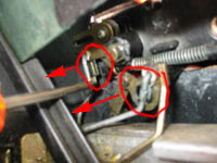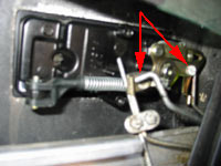 Remove the two bolts, easiest with a socket and extension. When this is out of the way you'll be able to see the workings of the handle. The Handle will now be loose and only held in place by the connections to the locks. There are two metal bars going into the workings of the handle. Remove their holding clips (small screwdrivers best) and pull them out of the plastic grommet.