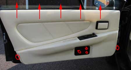 The picture above shows where the panel is attached. There are three screws in the interior door release and one low either side of the panel (circled). The panel is hooked into the door at the window and will need lifting to remove.