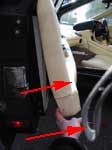 You'll have a one-piece panel once removed. To refit the panel, just reverse the process. Fit the connections. Hook the panel back onto the door. This is best done pushing the panel end in closest to the windscreen and then pulling down into place. One thing to watch for is there are some washers between the door release handle and the door (see above). These may need realigning is you took the screws all the way out. Do this before you put the panel on to make it easier.