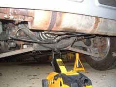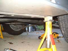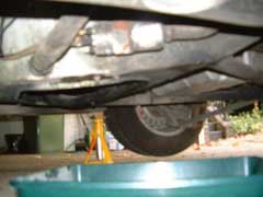 So all saftey points taken care of, jack the car up onto axle stands. I placed the trolley jack in the middle at the back on part of the chassis (left). I then placed the axle stands under the "official" jacking points using small wooden blocks between the stands and the car itself (middle). The Fuel Pump is situated underneath the LEFT hand side of the car just in front of the rear wheel - Roughly in line with the decal. (right)
