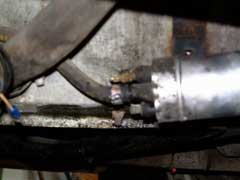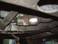 As I didn't have any mole grips to clamp off the fuel hoses, I decided to do as much as I could *before* starting to remove any of the fuel pipes. This involved replacing the push on type electrical spade connectors with screw on ones, unbolting the pump from the body of the car and removing the bracket which clamps the Fuel Pump to the body (right). Here you can see the fuel pump with one spade connector already removed. The (grimy) silver cylinder is the Fuel Pump. The large hose on the right is the feed FROM the petrol tanks. The rather rusty looking band in the middle is the bracket holding the pump to the body. On the left is the output pipe (heading off to the fuel filter) and the two electrical connections. You can see the bottom one has been removed already and the spade connector is exposed.