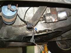 So, new connectors fitted the next thing to do was to free the pump from the metal bracket that clamps it to the body. This was quite awkward - you are upside down under the car - and as I couldn't get a socket in there, involved using a pair of long nosed pliers to hold the nut in place while using a 10mm spanner to undo the bolt. Completely remove the nut and bolt. (Don't Lose the Washer!)