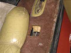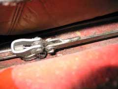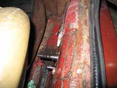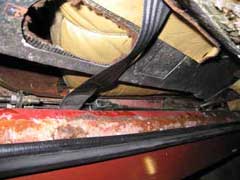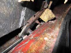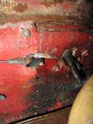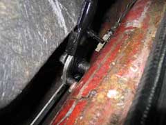 With the hand brake lever fully exposed it is now possible to undo the two nuts that connect it to the mounting plate in the sill – the smaller one at the back and the main one that the lever pivots on. These should come off fairly easily. I have read that S1 and S2 Esprits have weaker handbrake mountings on the sill – if this is the case then care should be taken when removing the nuts. Looking at my sill it appears that the revised mounting bracket was an afterthought at the factory with the sill being cut open and messily pieced back together again.