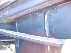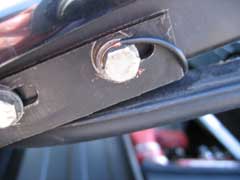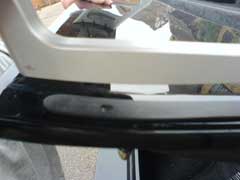 Drill right though the tailgate, which has an inner skin. The masking tape will help to stop cracking of the fibre-glass while you're drilling. Drill 3 holes one side (one for the brake light wires) and two the other. You'll also need to drill a bigger hole on the underside of the tailgate, so you can get the bolt head in. We used a washer to strengthen the tailgate.
