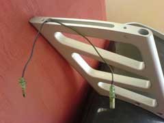 Above you can see a whole from our old wing, the wires coming through for the brake light and the hole for the new wing. Before wiring up the brake light, it's best to check it's working. We attached our wires to it and touched them on the battery to check the light was working ok.