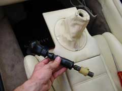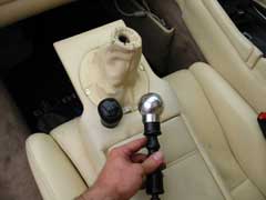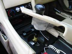 I won't explain how to unwrap your gearknob, but once you have it's time to take the center tunnel trim off so you can get at the gearstick. The MY92 tunnel has two screws that hold it under the compartment. Velcro holds it at one end and it slips under the pocket between the seats at the other. Check how yours is attached, as you don't want to be pulling at it, as this could damage it. Later models have the fuel cap switches, which will need disconnecting (from underneath the trim).
