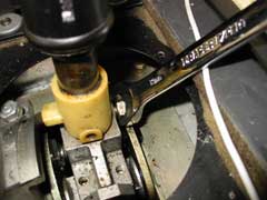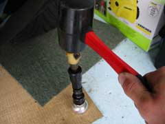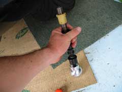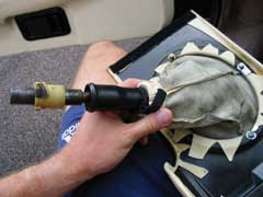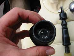 I now undid the cord to remove the stick from the leather gaiter. You now have a free gearstick to work on. Time to remove the old gearknob. Apparantly Lotus add a little glue to the stick before the knob goes on. Mine was too stiff to pull off, although some will come of easily with a bit of a pull if the glues seal has been broken. I wedged a large flat screwdriver between the knob and stick and loosened it by hitting it with a hammer. Once I'd worked around and loosened it a little, I could then pull the old leather knob off (ooh!). If you've got a vice, then it will make it much easier (remember to protect the stick when tightening the vice), but I managed without one.