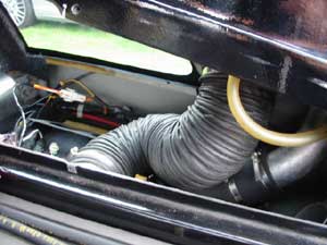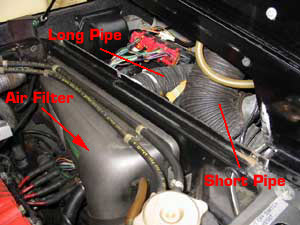 You'll see two pipes. One is short and goes from the outside air intake (behind the rear quarter light), into the engine bay. The second pipe is much longer (see picture below) and goes from the engine bay tube into the air box. You can see the pipes above, with the short pipe dropping down and running off to the right and the longer pipe running from the far left, passed the short pipe and off to the far right.