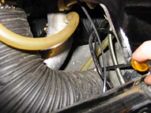 Using a flat-head screwdriver to loosen the jubilee clips from the pipes. There are four to do. The picture to the right shows where the air is forced into the tube passing into the engine bay and back out into the second pipe before entering the air box.