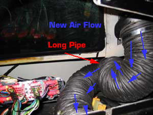 You now have two pipes off the car. To complete the conversion you have two options. You can use the long pip to connect from the outside intake straight to the airbox. This allows you to put the system back to it's original design. But this also leaves you with a long pipe going from the intake to the airbox. Effectively slowing down the air flow to the air box.