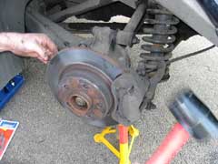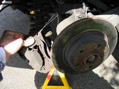 You may find these quite stiff. Remember if you are using WD40, do not get any on the discs or pads, as this will effect braking performance. Once the two bolts have been removed, you'll find the caliper still stuck to the disc. Time to remove the handbrake! You'll still find the caliper gripping the disc quite strongly. I used a rubber mallet to gently knock the caliper off the disc
