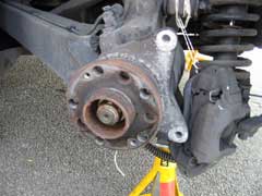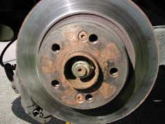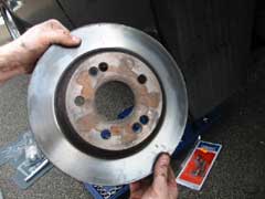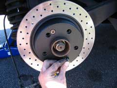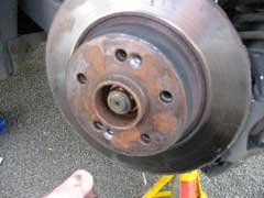 Now for removing the discs. You will need a large star head for your screw driver to undo the two screws holding the disc on. These can be found at any car accessory shop and aren't expensive. Now this could be a difficult job depending on who changed the discs last time, as some people tend to lock-tight (glue) this screws in. You might find it easier to loosen the screws with the calipers still holding the disc. Mine where easy to remove (luckily)! Once these screws are removed, simply lift the disc off the hub. Some people have to drill out the screws and then leave them off, as the wheel/caliper with hold the disc in place.