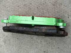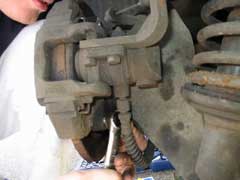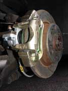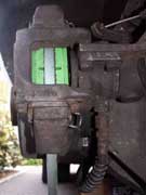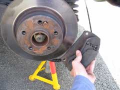 Firstly, a word of warning to anyone who thinks that passing an MOT means your pads are fine. My car was MOT'd only 2000 very sedate miles ago, yet as you can see from the photos the pads were completely gone! The only way to be sure is to take the wheel off and look through the back of the caliper, as can be clearly seen in the finished photo.